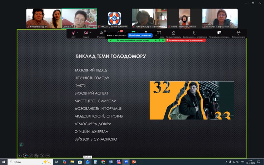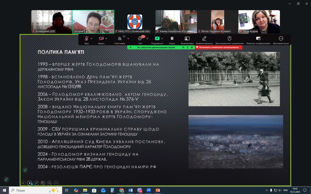 10 грудня 2025 року в педагоги Колківського ЦПО долучились до Всеукраїнського вебінару «Геноцидні дії росії проти України. Вплив Голодомору 1932–1933 років на ідентичність українців», під час якого були розглянуті питання: законодавство України про ідентичність та політику національної пам’яті, історичний контекст Голодомору, реакція світу на події 1932–1933 років в Україні, дослідники Голодомору-геноциду тощо; У семінарі взяли участь педагоги закладів професійної освіти Волинської, Донецької та Луганської областей. Обговорені на семінарі питання, поєднання теоретичних знань і практичного досвіду сприяли поглибленню розуміння трагедії Голодомору та її впливу на сьогодення.